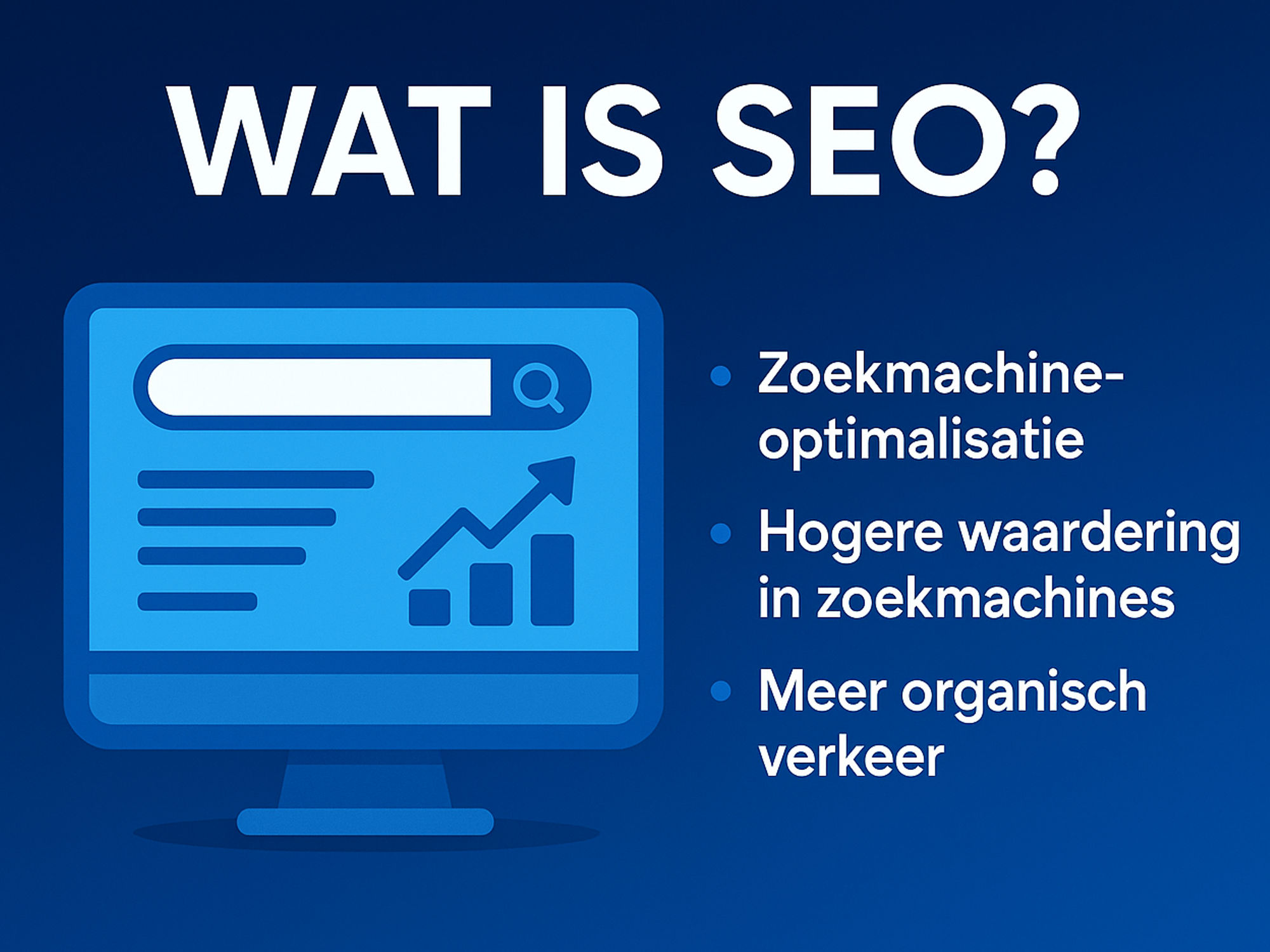 SEO, voluit Search Engine Optimization of zoekmachineoptimalisatie, is het proces waarmee een website beter vindbaar wordt in zoekmachines zoals Google. Het doel van SEO is niet alleen een hogere positie behalen, maar vooral zorgen dat de juiste bezoekers jouw website vinden. Door inhoud, techniek en autoriteit te verbeteren, begrijpt een zoekmachine beter waar een website over gaat en waarom deze relevant is voor een bepaalde zoekopdracht.